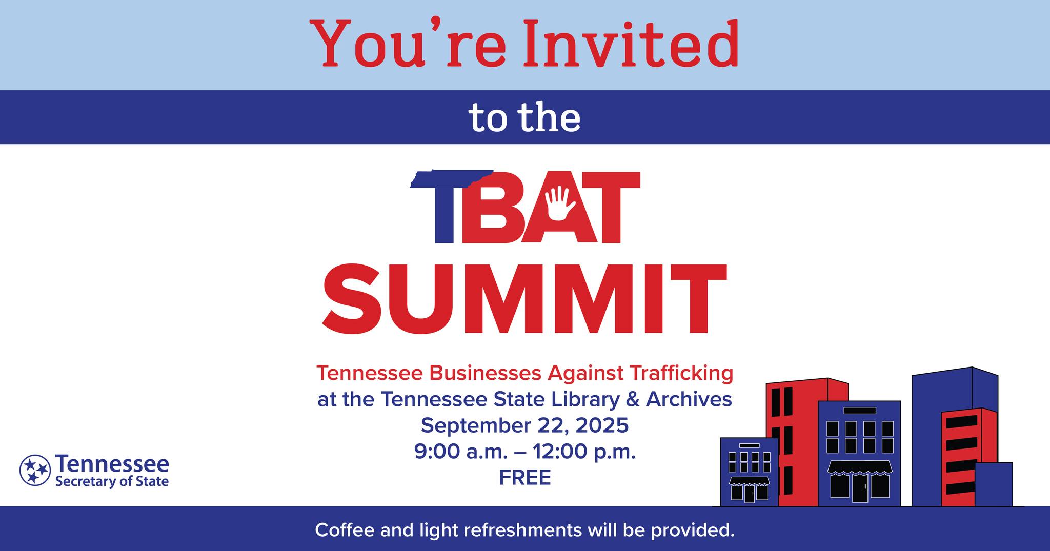 Join us at our first-ever TBAT Summit to connect with policymakers, subject matter experts, and survivors. Learn how to help stop human trafficking in Tennessee. Limited seating available. Reserve a seat for you and a colleague by clicking here: http://bit.ly/3IgzPEn. Free parking at the Tennessee State Library & Archives.